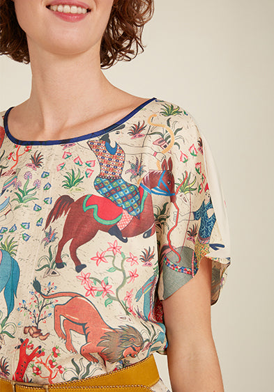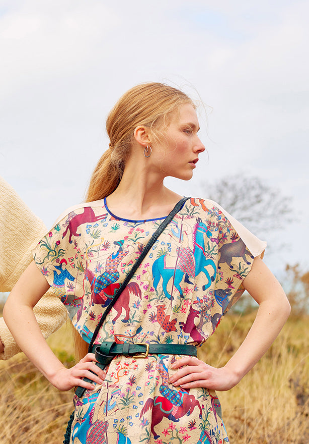 What can we say about the exclusive Cavaali Indien print with its amazing patterns that are as amusing as they are mysterious? Yes, there are people, animals and gardens, in a pattern, and on a noble fabric. An endearing touch that simply becomes one with the silhouette.
