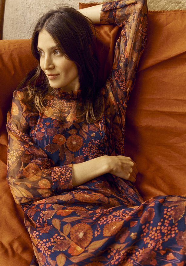 A floral and botanical inspiration, the vulnerability of skin respected by the soft caress of silk, designs created in watercolour showing a shadow of Japanese gardens and a statement of flowers and shades of red - a phenomenon represented by an exclusive Cotélac print.