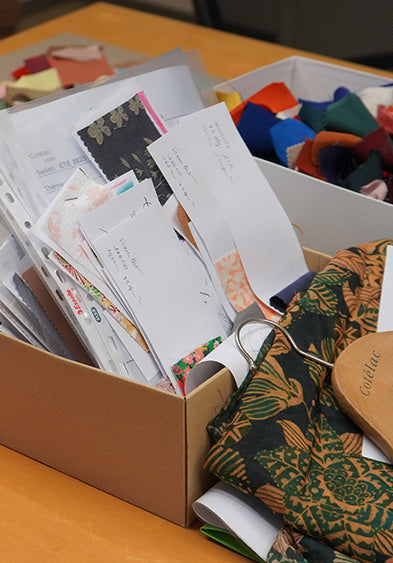 Our design process often begins with raw materials, rather than ideas for garments.“We select yarns or fabrics from trade fairs based on their look, their feel and their technical properties”, explains Assistant Style Director Janelle Cox.”We’ll order in samples, and only then do we start to think about designs using these specific fibers”. Assistant stylist Céline Wolf highlights the unusual nature of our methods:“This way of working is something I’d never come across before joining Cotélac”.“We don’t seem to work in the same way as other brands”, adds Nathalie Carrera, one of the stylists in our studio.