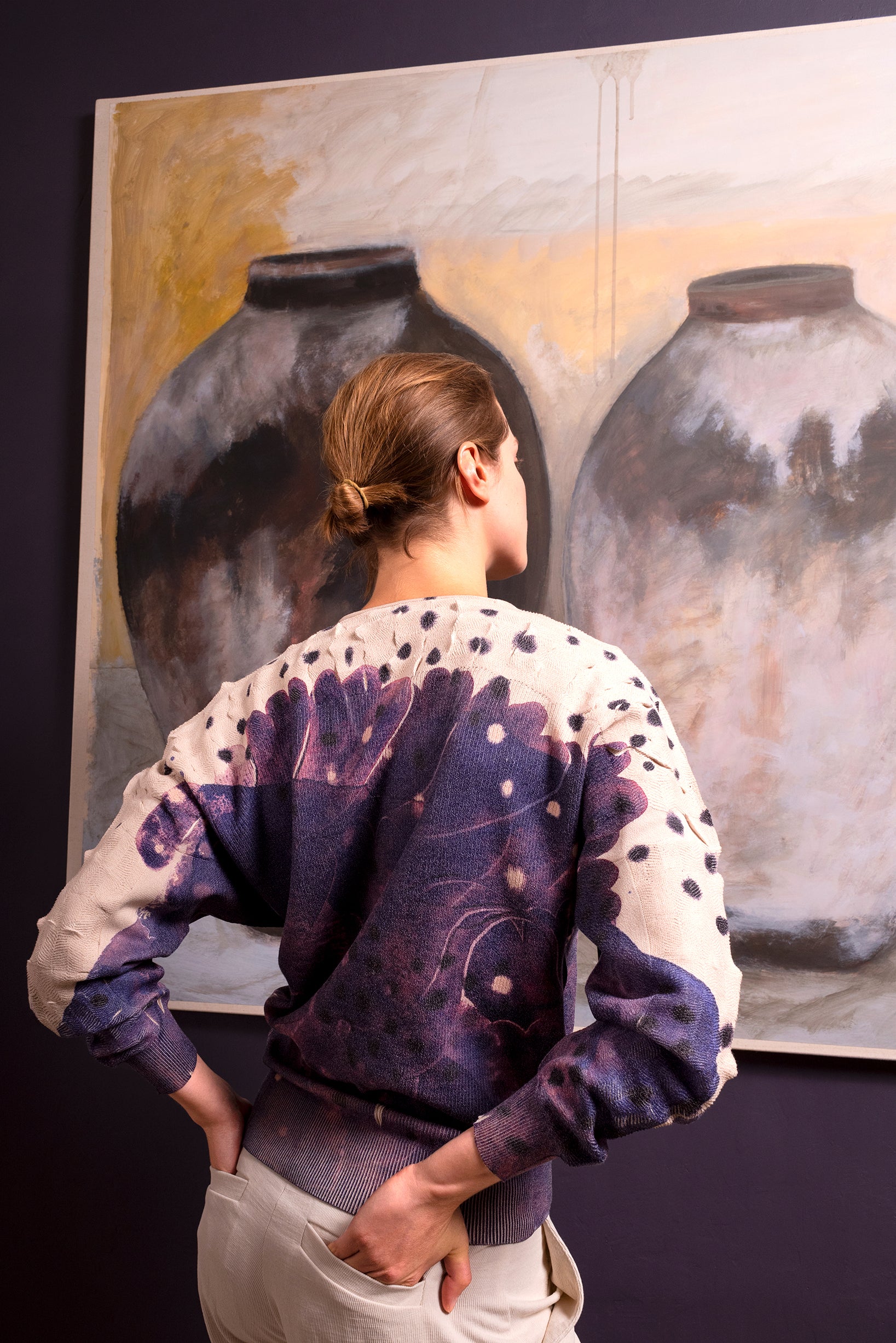 The watercolor designs, inspired by our baroque universe, are applied to a sporty-feel knit that combines comfort, technicality, and recycled polyester, blending creativity and responsibility.