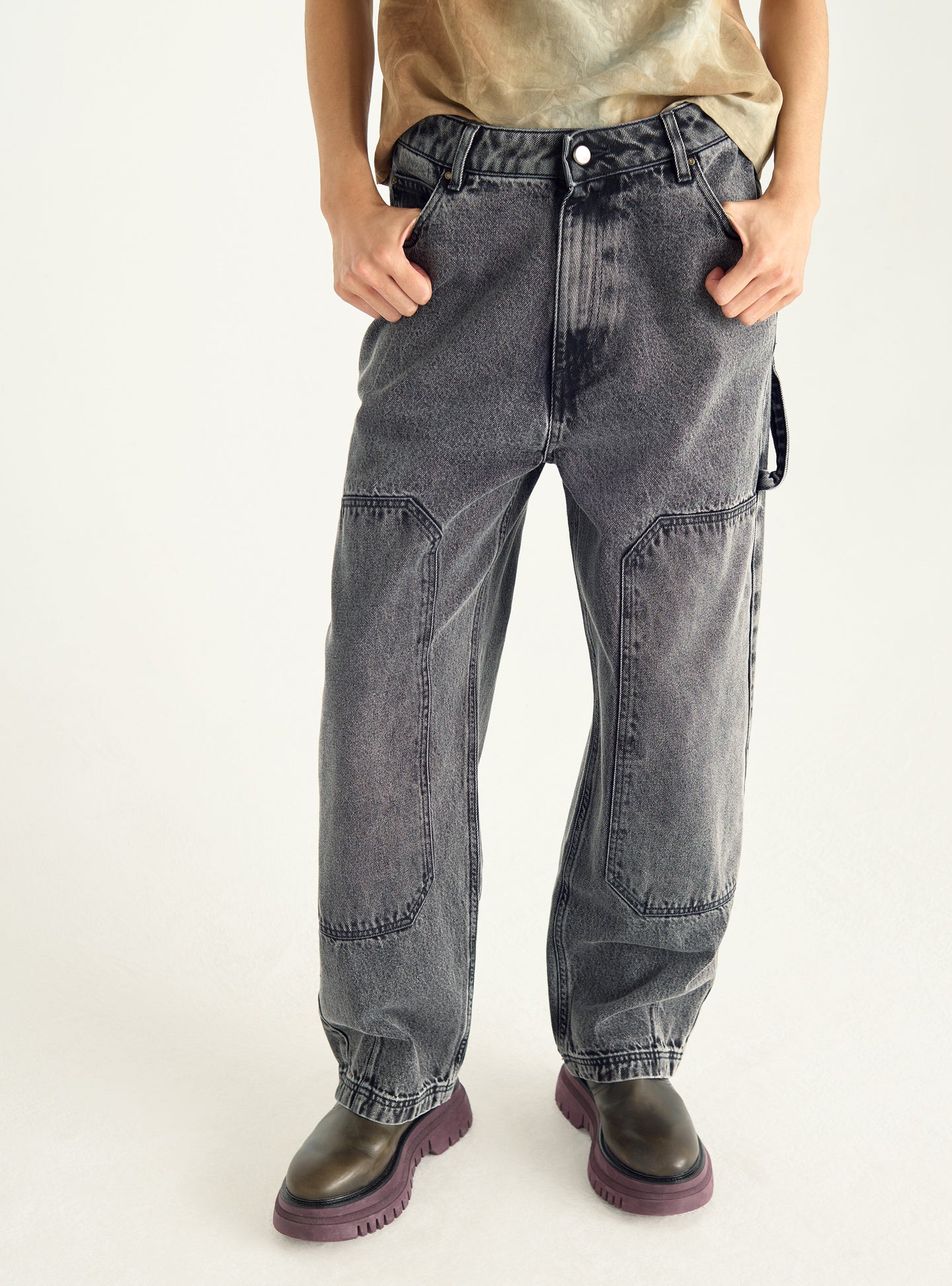 Relaxed-fit jeans, slightly loose on the thigh and tapered at the bottom of the leg. High waist structured by a belt loop, zipper closure, and metal button. Five classic pockets, graphic cutouts on the front, and a martingale buckle on the side, a nod to the utilitarian wardrobe. 100% cotton denim, raw and authentic, designed to develop a patina over time.