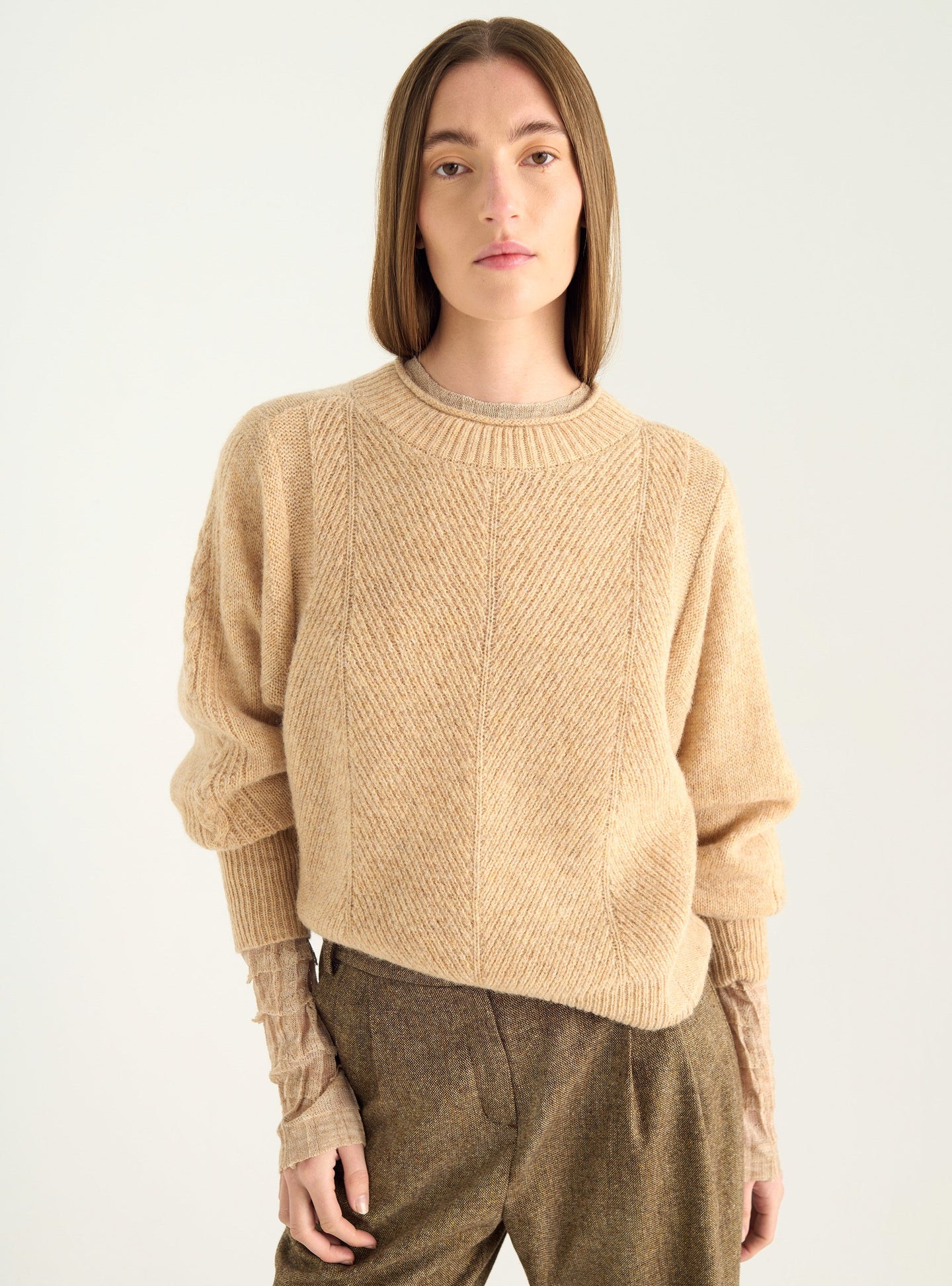 The long sleeves, inspired by the leg-of-mutton shape, create a sculpted silhouette, punctuated with decorative diagonal stitches and subtle cables.