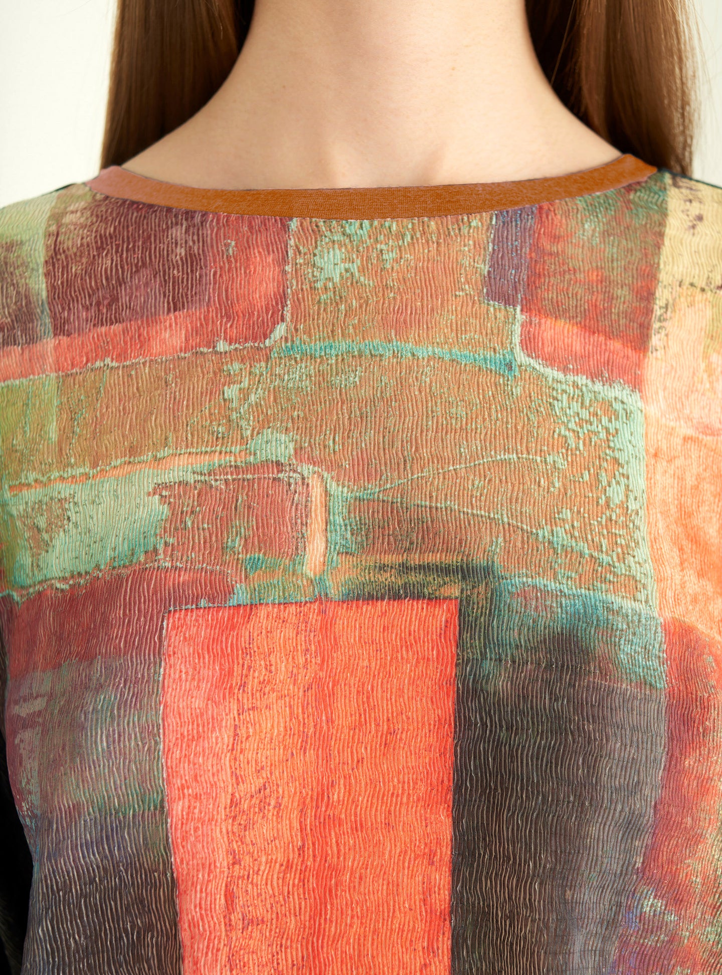 The dropped shoulders and loose fit add a nonchalant touch to this hybrid piece, which blends natural materials, textile innovation and artistic expression.